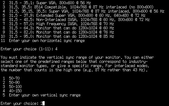 This is the first of the questions relating to the monitor. It is important that you choose wisely here. Don't pick a range that is outside of your monitor's specifications. This is less important on newer monitors, as they will not attempt to do something outside of their specifications. Older monitors might be damaged, though. When in doubt, pick a conservative range.
