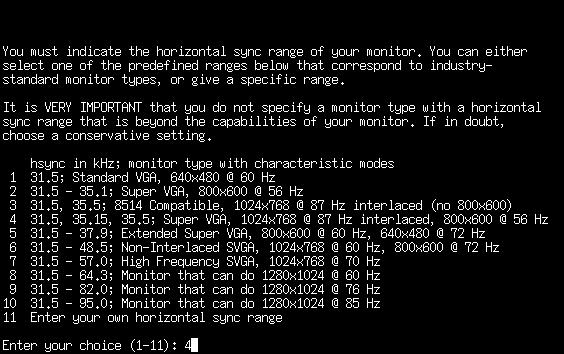 This is the first of the questions relating to the monitor. It is important that you choose wisely here. Don't pick a range that is outside of your monitor's specifications. This is less important on newer monitors, as they will not attempt to do something outside of their specifications. Older monitors might be damaged, though. When in doubt, pick a conservative range.